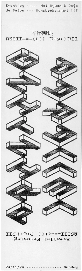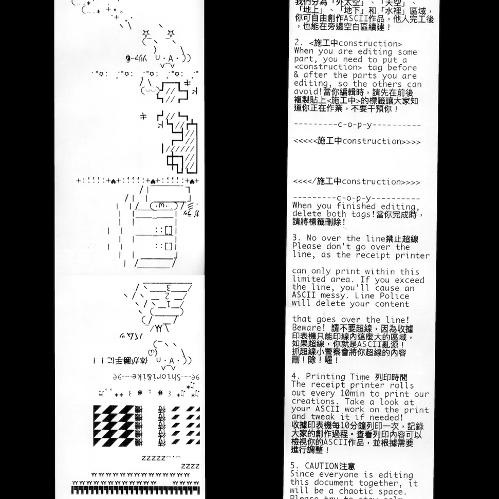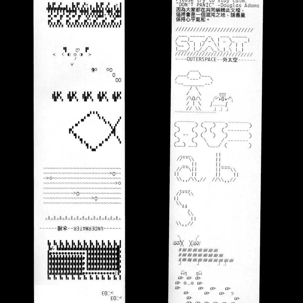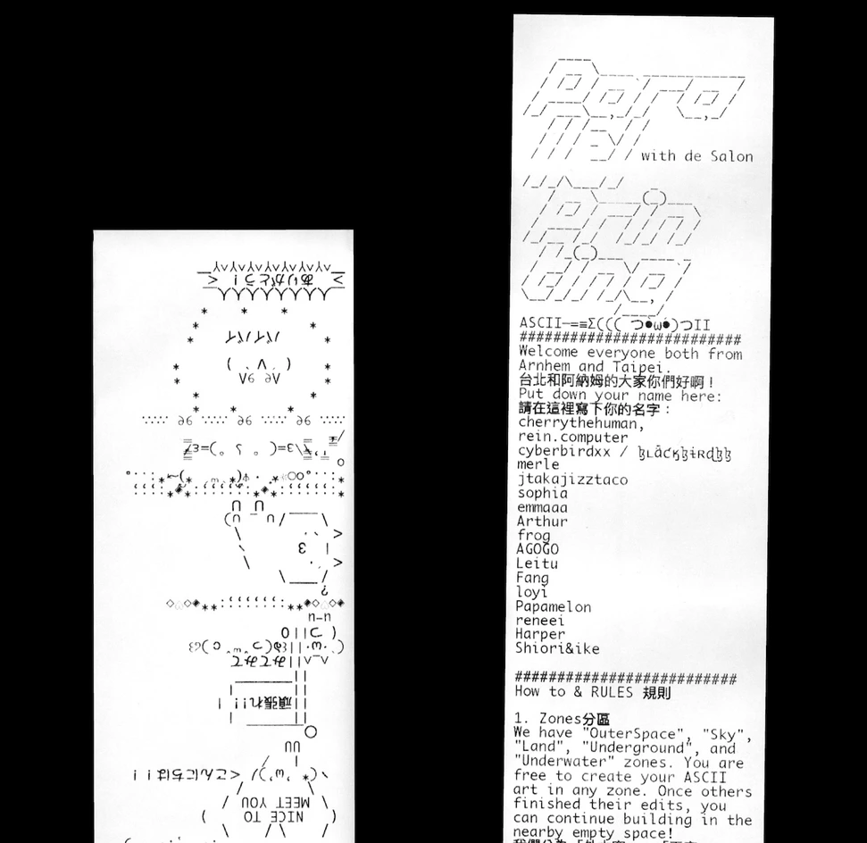 Parallel Printing: ASCII─=≡Σ((( つ•̀ω•́)つII is a transregional, inter-timezoned workshop de Salon hosted together with Taipei Art Book Fair. During the workshop, Doğa Gönüllü and Cherrythehuman moderated the process bilingually. Participants from Taipei(TW), and Arnhem(NL) entered a real time open source online editor to co-create. Collectively, we combined our individual ASCII art pieces into a larger, unified ASCII artwork. The results were printed simultaneously on receipt printers at both locations.